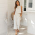 Le haut sans manches présente des boutons dans le dos, ajoutant une touche de style bohème et d'originalité à l'ensemble. Le pantalon est doté d'une taille élastique et d'une coupe fluide pour une liberté de mouvement optimale. Tandis que les jambes larges et évasées accentuent le look bohème et hippie.